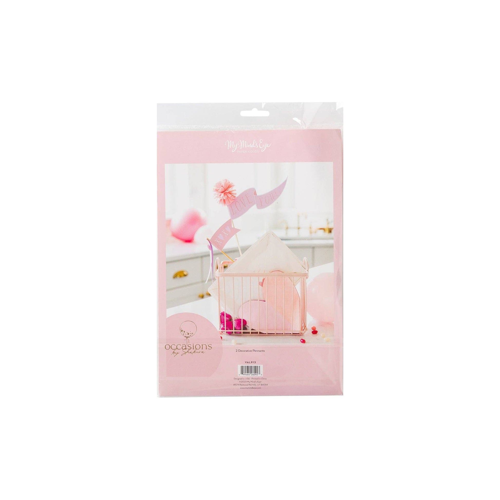 Add a super sweet touch to your Valentine's table with this pennant flag set. Included is a 10 inch tall "Love You!" flag with a pom pom accent and a 7 inch XOXO flag with ribbon and heart accents. These flags are the prefect way to make a statement with a Valentine's cake or send a sweet message to your guests when they are featured in jars full of your favorite Valentine's candy!