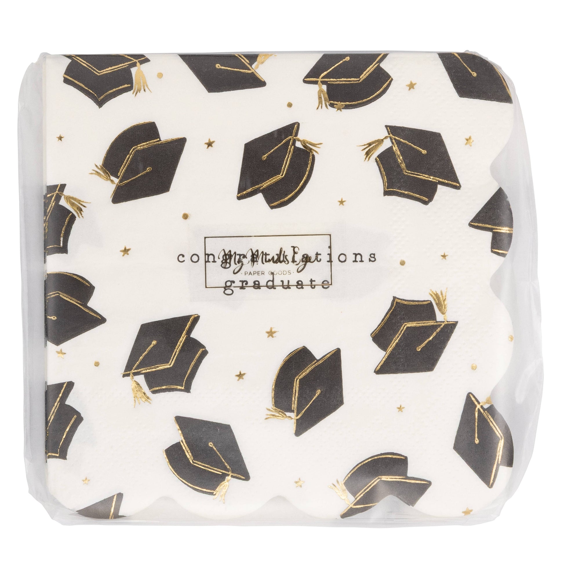 Celebrate graduation season with these festive Grad Hat Scatter Napkins! Perfect for your graduation party, these charming napkins feature a playful pattern of scattered grad hats. Ideal for adding a fun, themed touch to your celebration tables, these cocktail-sized napkins are a must-have for any academic milestone event. • Grad Hat Pattern paper cocktail napkins in black on cream with "CONGRATULATIONS GRADUATE" imprint • Set of 18 paper napkins • Gold foil detailing • Folded size: 5" wide x 5" tall View the Graduation collection HERE 3 sets make 1 wholesale pack.