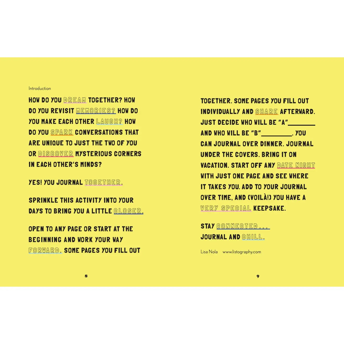 Taking time to journal together is a meaningful way for couples to connect. Designed to spark conversation and intimacy, this illustrated journal features over 75 prompts about your past, present, and future as a couple. From favorite memories" and "what I love about you" to "first impressions of each other" and "things we agree to disagree on, topics are thought-provoking, sweet, humorous, and honest. With a handful of activities and quizzes (drawing amateur portraits, playing Who's More Likely To?), Date Night In offers a fun and accessible way for you to reflect and dream together, and create a lasting and unique keepsake in the process.