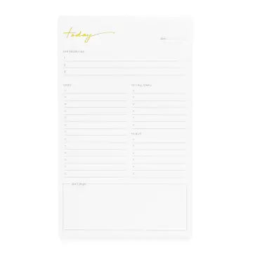 No task too tall. The Breathing Room x Sugar Paper Today Pad brings a sense of simplicity to even the busiest of days with its clean, streamlined daily notepad layout that keeps track of tasks, activities, correspondence, and more with a classic white paper with gold foil detail that we love.